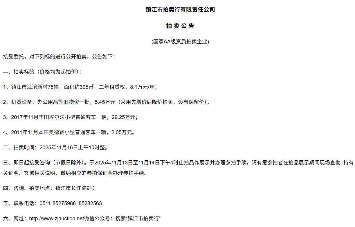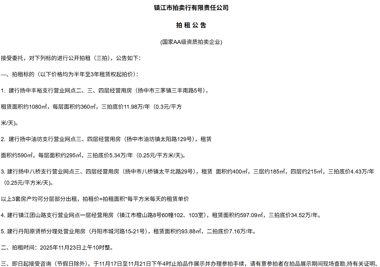 鎮江市拍賣行有限責任公司拍 租 公 吿(國家AA級資質拍賣企業)接受委托,對下列標的進行公開拍租(三拍),公告如下:—、拍租標的(以下價格均為半年至3年租賃權起拍價):1.  建行揚中豐裕支行營業網點二、三、四層經營用房(揚中市三茅鎮三豐南路5號),租賃面積約1080㎡,每層面積約360㎡,三拍底價11.98萬/年(0.3元/平方米/天)。2.  建行揚中油坊支行營業網點三、四層經營用房(揚中市油坊鎮太陽路129號),租賃面積約590㎡,每層面積約295㎡,三拍底價5.34萬/年(0.25元/平方米/天)。3. 建行揚中八橋支行營業網點三、四層經營用房(揚中市八橋鎮太平北路29號),租賃  面積約400㎡,三層約185㎡,四層約215㎡,三拍底價4.43萬/年(0.25元/平方米/天)。以上3套房產均可分層部分出租,拍租價=拍租面積*每平方米每天的租賃單價4. 建行鎮江團山路支行營業網點一層經營用房(鎮江市檀山路8號60幢102、103室),租賃面積約597.09㎡,三拍底價34.52萬/年。5. 建行丹陽原賢橋分理處營業用房(丹陽市城河路15-21號),租賃面積約93.88㎡,二拍底價7.16萬/年。二、拍租時間:2025年11月23日上午10時整。三、即日起接受咨詢(節假日除外)。于11月17日至11月21日下午4時止拍品作展示并辦理參拍手續,請有意參拍者在拍品展示期間現場查勘,持有關證明、簽署相關說明、繳納相應的參拍保證金辦理參拍手續。四、咨詢、拍租地點:鎮江市長江路9號五、聯系方式:0511-85275988   13655299933楊先生六、網址:http://www_zjauction_net.articlesisland.com;微信公眾號:搜索“鎮江市拍賣行” 拍品清單2025.11.23序號名稱起拍價(元)標的說明1建行揚中豐裕支行營業網點二、三、四層經營用房(揚中市三茅鎮三豐南路5號),租賃面積約1080㎡,每層面積約360㎡三拍底價11.98萬/年(0.3元/平方米/天)1、1-3號房產均可分層部分出租,拍租價=拍租面積*每平方米每天的租賃單價;2、意向競拍人在拍賣前需持營業執照或身份證與委托方說明租賃房產經營業態,確定意向后出具房產承租用途承諾書,經委托方審核后,方可交納保證金參加競拍;3、租賃期限為半年至3年(承租方與出租方協商而定),承租方每半年或一年結付租金,租賃期間的水、電費用及其它相關費用均由承租方承擔;4、承租方不得用于經營和保管危險物品,不得用于開設餐飲、娛樂等可能嚴重影響消防安全、運營安全的經營業態,不得用于經營委托貸款、小額貸款等可能冒用委托方名義,帶來聲譽風險的經營業態。租賃期內,承租方不得破壞墻體結構,自行成就消防、安全等使用條件,不得擅自將租賃房屋轉租、轉讓給他人使用,否則委托方有權收回房屋;5、拍租成交后,承租方將租金交至出租方指定賬戶,傭金交至拍賣方賬戶(拍租傭金為該房屋一個月租金)。承租方憑租賃合同無息退還保證金。2建行揚中油坊支行營業網點三、四層經營用房(揚中市油坊鎮太陽路129號),租賃面積約590㎡,每層面積約295㎡三拍底價5.34萬/年(0.25元/平方米/天)3建行揚中八橋支行營業網點三、四層經營用房(揚中市八橋鎮太平北路29號),租賃面積約490㎡,每層面積約245㎡三拍底價4.43萬/年(0.25元/平方米/天)4建行鎮江團山路支行營業網點一層經營用房(鎮江市檀山路8號60幢102、103室),建筑面積約597.09㎡三拍底價34.52萬/年5建行丹陽原賢橋分理處營業用房(丹陽市城河路15-21號),建筑面積約93.88㎡二拍底價7.16萬/年